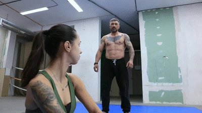 Rowen thought he was really tough guy because he's so muscular and brutal. He wasn't used to women contradicting him. So now he came to the gym, and when he saw tiny Tiffany, he decided that he could easily make her do what he wanted. But Tiffany's eyes widened in surprise when she heard how dare he talk to her. She didn't even think about obeying, she immediately challenged the guy to a fight and showed him all the fighting techniques she owned, including windshield wiper kicks and mounted punches. But Rowen turned out to be a worthy opponent. Several times it seemed that Tiffany had no chance of winning, despite all her skills. But the light and agile Tiffany continued to get up and circle around the heavy and unwieldy opponent. Finally, she managed to knock Rowan out with a roundhouse kick. Tiffany makes a winning pose, placing her foot on the chest of a defeated opponent, and continues her workout, interrupted by an impudent jock.