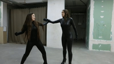 Part 1: Agent SELENA and Agent CLAIRE both confident hitwomen hired to eliminate each other, i hope your crew could create the dialogue for them. (this time their suit 's zipper is already pull down (not to the lowest position, half part is ok, when they finish their dialogue, they pull up their zippers and fight) (4 minutes)